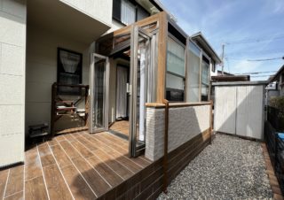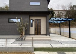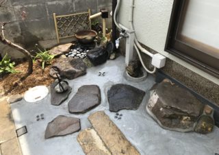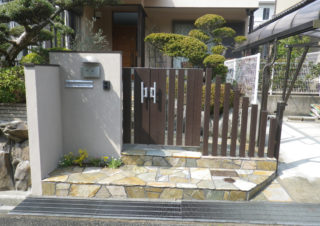 門扉が活きるレトロモダンな玄関リフォーム 外構工事 2021.05.172022.04.26 稲美町 F様邸 施工前 作業風景 壁面は家壁に合わせたタイルを上から貼り替え、床は乱形石貼り「ピンククオーツ」を貼りました。どちらも劣化しにくい商品ですので、長期間景観を維持してくれます。玄関前がタイルの重厚感と石の華やかさで素敵になりました。