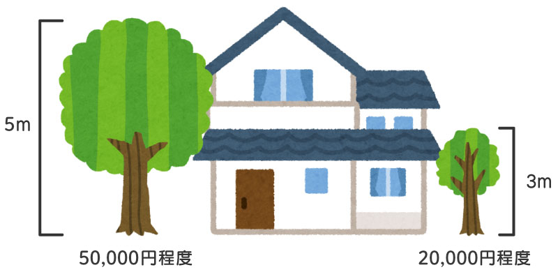 1本よりお受けいたします。高さ3m(家の1階の高さ)くらいの雑木で20,000円(ゴミ処分、諸経費込)高さ6m(家の2階の高さ)くらいで50,000円が目安です。樹木の仕立て方や樹種などによって価格は変わってきますが、手入れする本数が多いほど割安で、20坪ほどの一般的な和庭で7〜10万円が平均価格です。